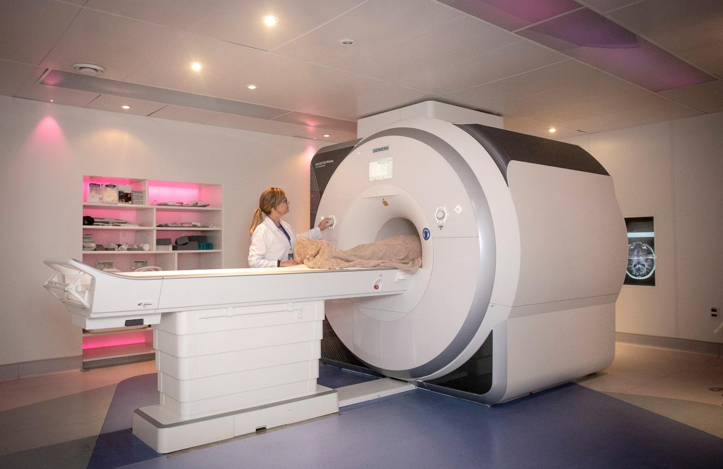 image: The fMRI machine located in the IDOR imaging suite. fMRI is used to indirectly detect increased neuronal activity in an area of the brain by measuring higher levels of oxygenated to deoxygenated blood.