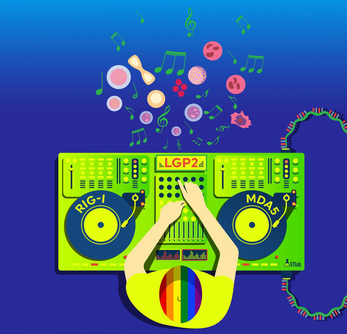 image: Repetitive elements induce a RIG-I-like receptor-mediated inflammation that regulates the emergence of hematopoietic stem and progenitor cells. Lefkopoulos et al. report that repetitive element (RE) RNA present during developmental hematopoiesis activates the RIG-I-like receptor pathway to provide the inflammatory signals necessary for HSPC formation. The RE RNA is depicted as cables that fuel the 'DJ controller' with electricity. RIG-I and MDA5 function as decks for the controller to play music, which represents the inflammatory signals turning into blood cells, whereas LGP2 functions as a mixer by controlling the levels of inflammation RIG-I and MDA5 provide. Nature is all-inclusive, like a rainbow.