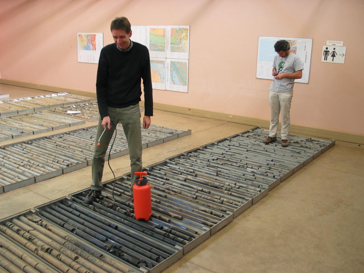 image: Research team leader sprays water on drill cores to see sedimentary rocks and select samples for this study.