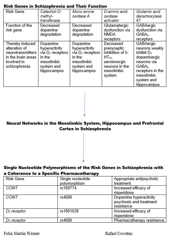 Dr. Felix-Martin Werner, working at the Euro Academy Pößneck in Germany and Prof. Rafael Coveñas, working at the Institute of Neurosciences of Castilla and León, Salamanca in Spain, have been working on neurological and psychiatric disease for over ten years. In their most recent review, published in Current Pharmaceutical Design (Bentham Science Publishers) Werner and Coveñas cover information about the risk genes in schizophrenia and explain the importance of examining their single nucleotide polymorphisms (SNP's). In schizophrenia, 260 risk genes have been discovered, and an association between single SNPs and the clinical efficacy of a specific antipsychotic drug has been established. Among the risk genes in schizophrenia, the COMT, MAO A/B, GAD 67, DAOA, dysbindin-1 and neuregulin-1 genes are described, and their functions can be represented by an updated neural network model of the ventral tegmental area, hippocampus and prefrontal cortex. The COMT and MAO A/B genes encode a decreased dopamine degradation. As a consequence, dopamine hyperactivity via D2 receptors occurs in the hippocampus and ventral tegemental area. The GAD 67 gene encodes a GABA dysfunction. Consequently, GABAergic neurons weakly inhibit D2 dopaminergic neurons in the hippocampus and ventral tegmental area via GABAA receptors. The DAOA gene encodes a glutamatergic dysfunction. This leads to a weak presynaptic inhibition of 5-HT2A serotonergic neurons in the hippocampus and ventral tegmental area via NMDA receptors. Dysbindin-1 and neuregulin-1 genes encode as well a glutamatergic dysfunction. The most important SNPs, which show an association with a specific pharmacotherapy, are mentioned. The SNP rs169774 of the COMT gene and the SNP rs1801028 of the D2 receptor gene are linked with an increased efficacy of the antipsychotic drug risperidone. The SNP of the COMT and D2 receptor genes are related with a dopamine hyperactivity psychosis and treatment resistance. Patients suffering both hyperactivity and resistance could be treated with the antipsychotic drug clozapine in combination with the novel antipsychotic drug cariprazine. This drug combination improves the PANSS total score in treatment-resistant schizophrenic patients. "By examining in a cohort of schizophrenic patients the SNPs of the risk genes, it will be possible to differentiate patients with a good response to a specific antipsychotic drug from those with treatment resistance," notes Dr. Werner.