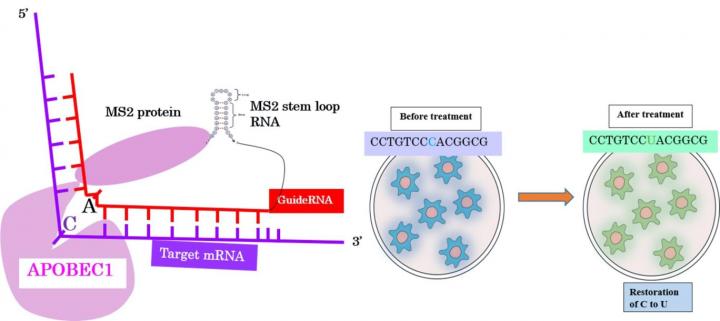 Various genetic diseases caused by point mutations have no established therapeutic approaches. Prof. Tsukahara and colleagues (Japan Advanced Institute of Science and Technology) are studying a therapeutic method using artificial RNA editing. It was announced that this year's Nobel Prize in Chemistry will be given to the two scientists who discovered CRISPR/Cas9 for genome editing. Although genome editing is drawing attention as a gene repair technology, genome editing such as CRISPR/Cas9 may result in permanent alterations in genomic DNAs, potentially affecting multiple loci. Currently, it is very difficult to perform accurate genome editing in all targeted cells in vivo. So, it is possible to edit the genome in a fertilized egg, embryo, or cells, however, it is not suitable for gene therapy in humans. Moreover, genome editing raises ethical concerns. Therefore, we believe that genome editing is a suitable method for "ex vivo" techniques, or for use in fertilized eggs, but not throughout a patient's body. In contrary, changes resulting from the RNA editing are not permanent because they do not affect the genome sequence, and can be done in sequence-specific manner. Therefore, for the purpose of therapeutic treatments, RNA editing is preferable to genome editing, says Prof. Tsukahara. Artificial site-directed RNA editing is an important technique for modifying genes and ultimately regulating protein function. We are trying to modify the genetic code of transcripts (RNA) by artificial RNA editing for the treatment of genetic disorders.