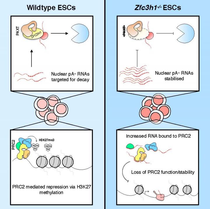 Interestingly, removal of the PAXT component ZFC3H1 using CRISPR/Cas9 in mouse ESC subsequently disrupted their ability to differentiate. High throughput sequencing analysis revealed that Zfc3h1-/- knockout (KO) ES cells showed increased expression of differentiation associated RNAs that are usually silenced by the PRC2 complex. Upon further investigation, it was shown that the function and stability of the PRC2 complex was compromised due to excess binding of RNA as a consequence of Zfc3h1-/- KO. Together, this highlights the importance of maintaining a stable nuclear transcriptome through active RNA decay to prevent off-target effects as a result of RNA accumulation.