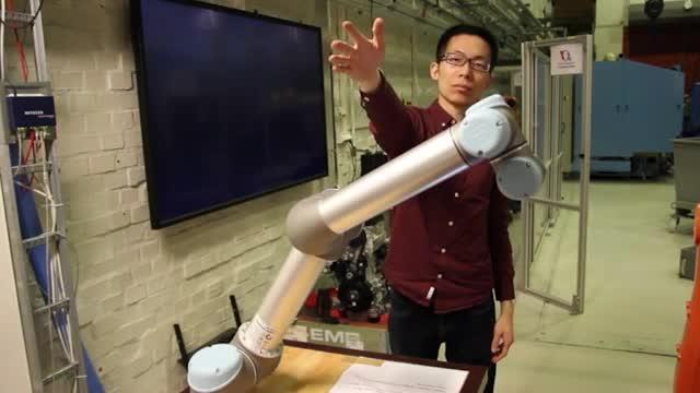 video: KTH researcher Hongyi Liu tests a robot arm by placing his hand in its path.