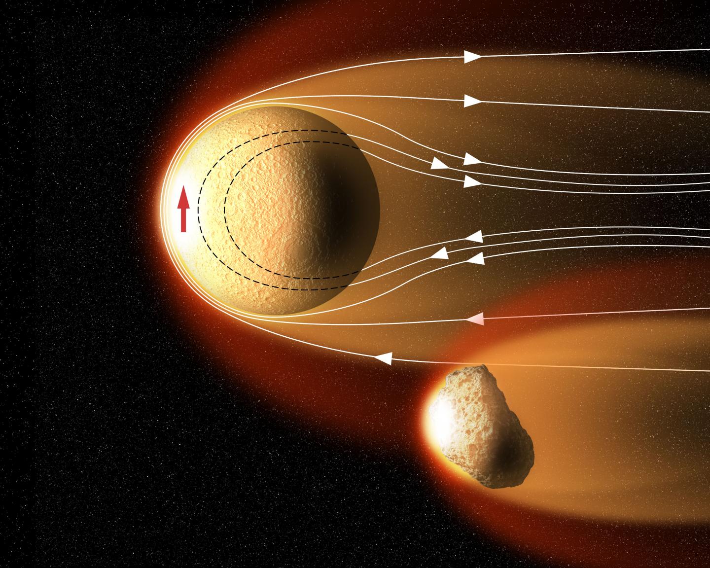 image: Illustration of solar wind flowing over asteroids in the early solar system. The magnetic field of the solar wind (white line/arrows) magnetizes the asteroid (red arrow). Researchers at the University of Rochester used magnetism to determine, for the first time, when carbonaceous chondrite asteroids first arrived in the inner solar system.