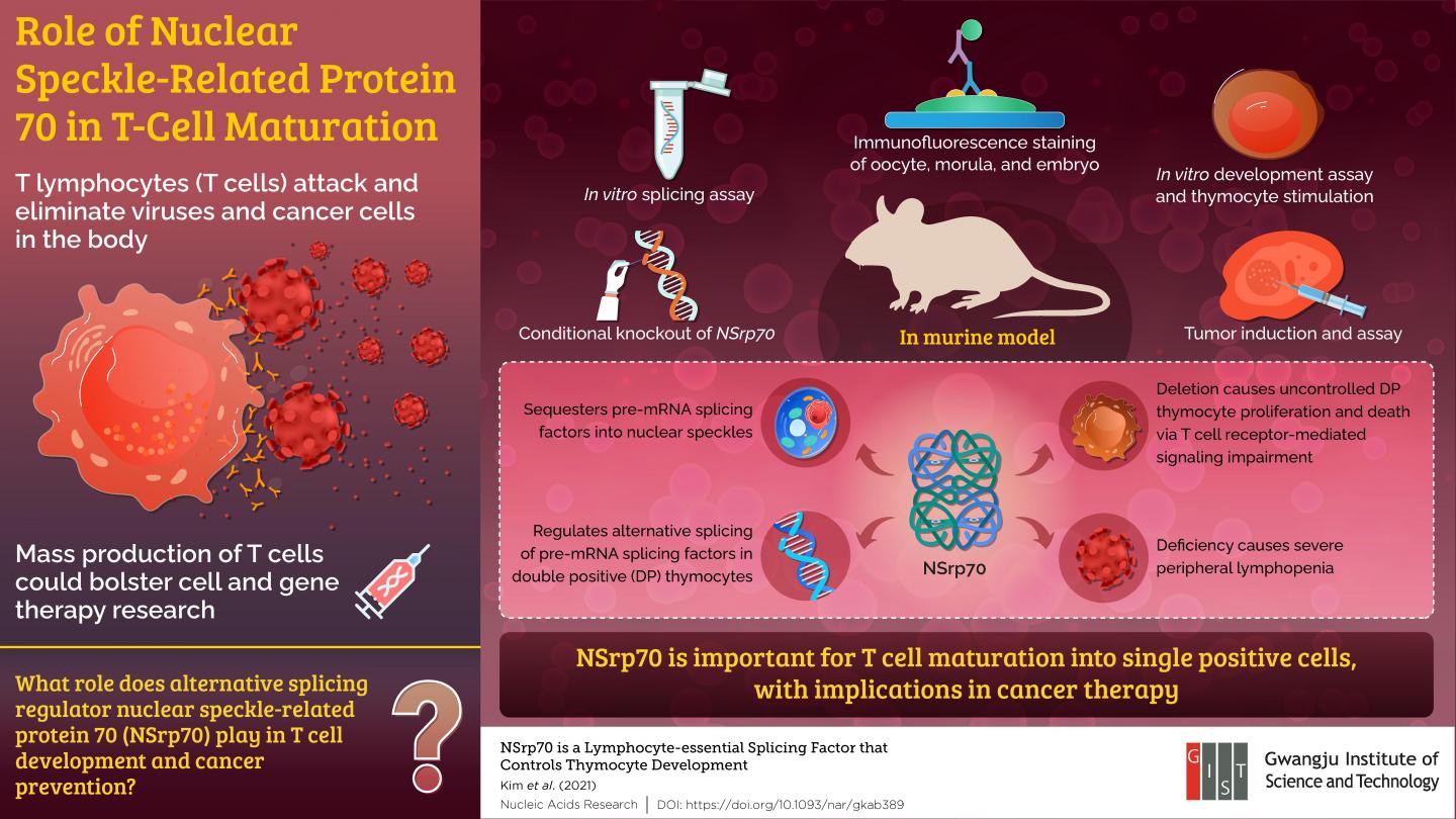 They report that NSrp70 is expressed very early in the cell cycle and plays an important role in T cell development. Specifically, the absence of the protein induced uncontrolled cell growth and death in double positive thymocytes that are T cell precursors. This impeded their progression to single positive thymocytes stymying the formation of mature T cells. NSrp70-deficient mice had a noticeably reduced lymphocyte count in peripheral tissues, and, thus, resulted in unchecked tumor growth, further attesting to the role NSrp70 plays in cancer development. Prof. Jun sums up the findings emphatically, "Our study revealed that NSrp70 is an important regulator of T cell proliferation. This finding can help us mass-produce specific T cells for cell therapy or use mass-produced T cells to inhibit the proliferation of cancer cells through gene therapy."