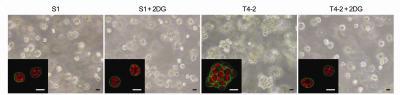 These phase contrast and confocal immunofluorescence images (inset)show 3-D cultures of non-malignant (S1) and malignant (T4-2) human breast cells in which glucose metabolism is inhibited by the addition of 2-deoxy-D-glucose (2DG). Suppressing glucose uptake leads to a phenotypic reversion of malignant cells (they look normal) while not affecting the non-malignant cells.