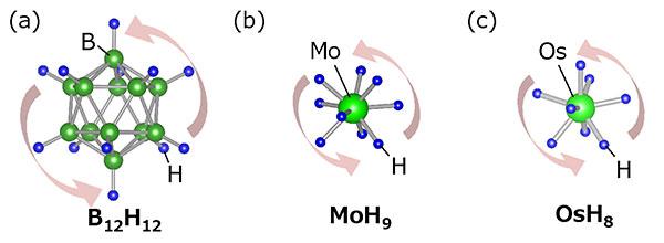 The research group was able to reduce the activation temperature by using transition metal hydride complexes as a new class of rotatable polyanions, wherein hydrogen is the sole ligand species, covalently binding to single transition metals. Unlike in B12H122- polyanions (Fig. 1a), the rotation of transition metal hydride complexes only requires displacements of highly mobile hydrogen (Figs. 1b, 1c) and can therefore be expected to occur with low activation energy.