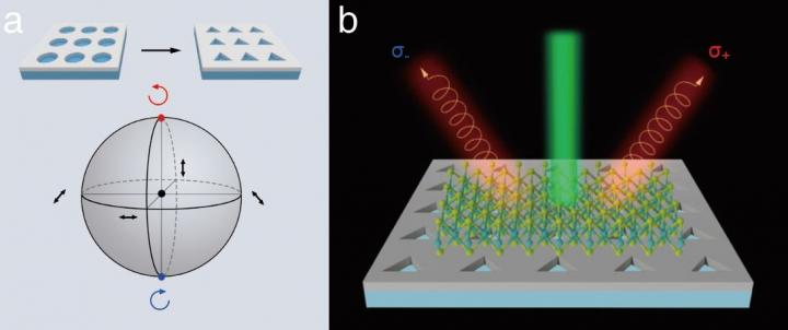 image: a, PhC slabs with C4 symmetry and without in-plane inversion symmetry. By breaking the in-plane inversion symmetry, the polarization states of PhC can cover entire Poincaré sphere's two poles. b, Illustration of photoluminescence of WS2 monolayer on the PhC slab without in-plane inversion symmetry.