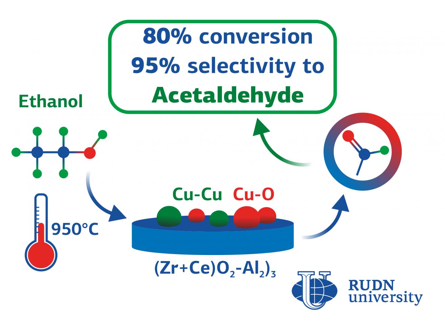 "All obtained systems demonstrated ? high alcohol conversion and selectivity to acetaldehyde. The copper containing catalysts with 5% aluminium oxide produced significant amounts of acetaldehyde with selectivity above 80 % at 3600C. We found that the mixed composition of the oxides creates conditions for the formation of active centres on the surface of the catalyst from copper ions with different charges. The best option is to use a mixture of oxides with a small content of aluminium in the synthesis of the catalyst and calcinate them at 950°C", Anna Zhukova from RUDN University
