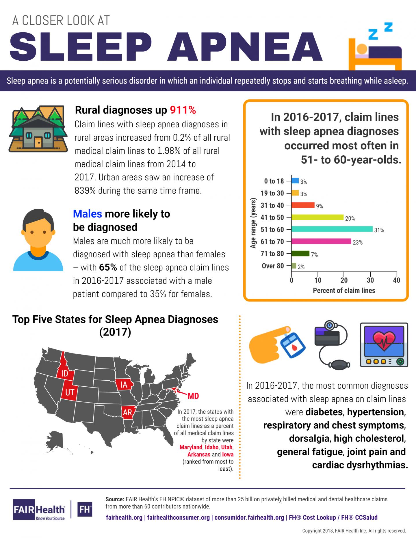 NEW YORK, NY--March 6, 2018--From 2014 to 2017, private insurance claim lines with a diagnosis of sleep apnea--a potentially serious disorder in which a person repeatedly stops and starts breathing while asleep--increased by 911 percent in rural America, according to FAIR Health, a national, independent, nonprofit organization dedicated to bringing transparency to healthcare costs and health insurance information. In contrast, urban areas recorded an increase of 839 percent in the same time frame. In the nation overall, claim lines with a diagnosis of sleep apnea grew 850 percent.