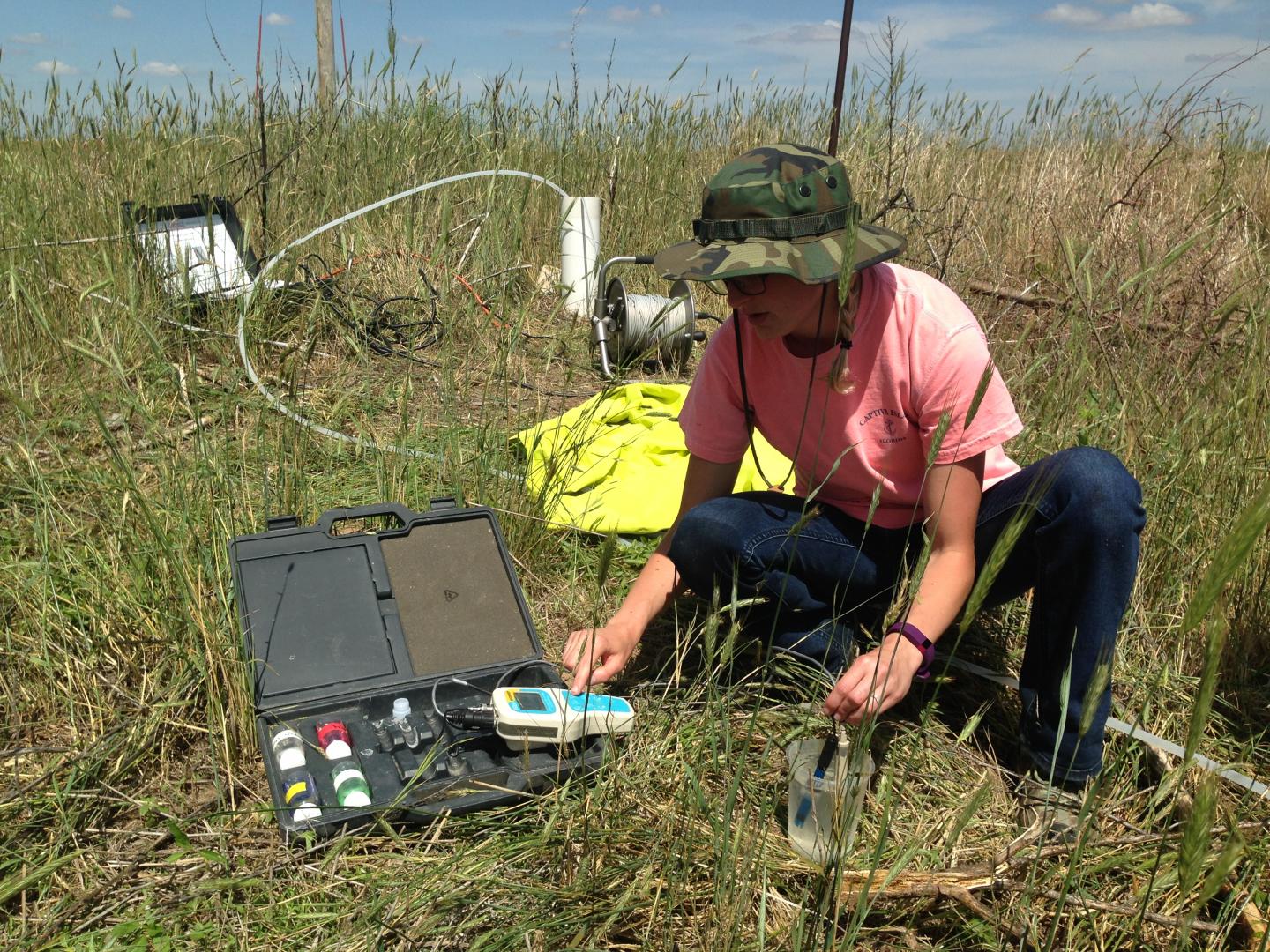 image: Kansas State University master's in geology graduate Allie Richard Lane samples water from wells as part of a 40-year comparison study of wells in the Great Bend Prairie Aquifer. The study has revealed water quality issues.
