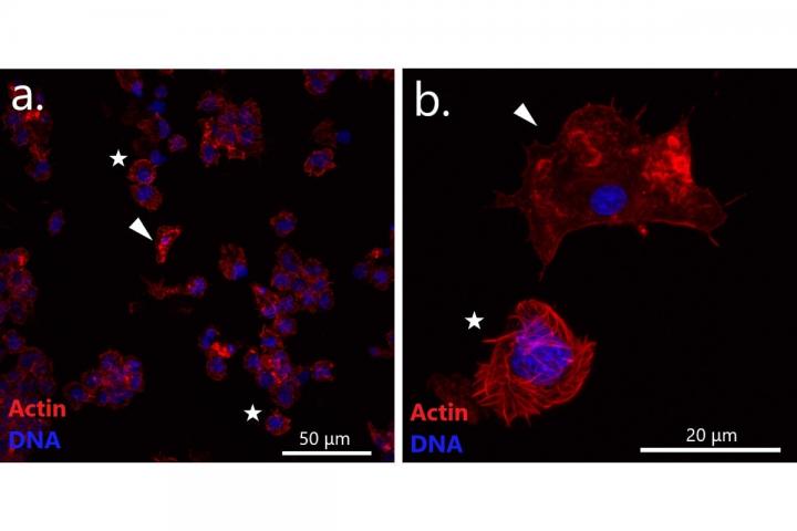 image: Confocal microscopy images of haemocytes of a DN-suggested mussel (J54) stained with DAPI (blue) and TRITC-labelled phalloidin (red). Images (a, b) are at two different magnifications (note the scale bars). Arrowheads point to normal adherent haemocytes with a small compact nucleus. Stars mark neoplastic aneuploid round cells with a large lobed nucleus and an altered actin cytoskeleton.