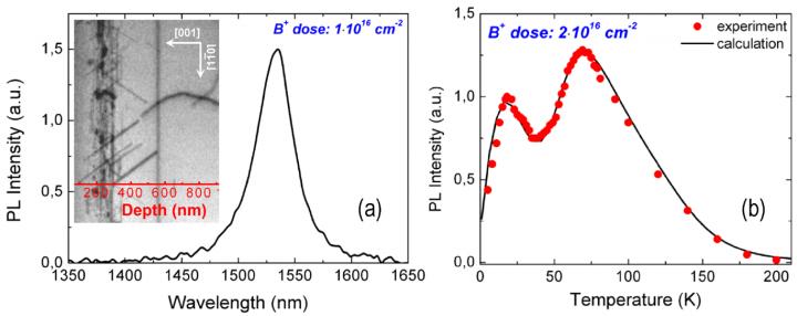 image: Figure 1. Dislocation-related luminescence spectrum of self-implanted silicon at 77 K (a) and its temperature dependence (b) after boron doping. The insert shows a TEM image of the light-emitting layer doped with boron.