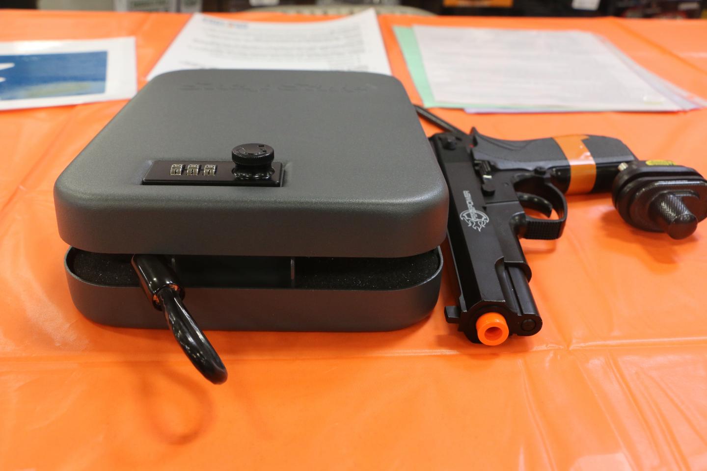 image: Firearm safety devices on display at a recent pubic firearm-safety event put on by Seattle Children's.