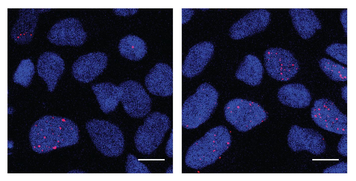 image: Cells that will eventually become neurons (neural progenitor cells) derived from individuals with autism spectrum disorder, shown in the right panel, exhibit increased DNA damage detected by ?H2AX, shown in the red stain, compared to those derived from healthy individuals (left panel).