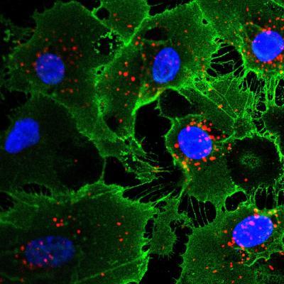 These are endothelial cells derived by indirect lineage conversion from human fibroblasts (skin cells). Cell nuclei are in blue; proteins that are hallmarks of endothelial cells are green and red.
