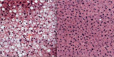 These images of liver tissue show the difference in fat accumulation between two groups of mice fed a high-fat diet.