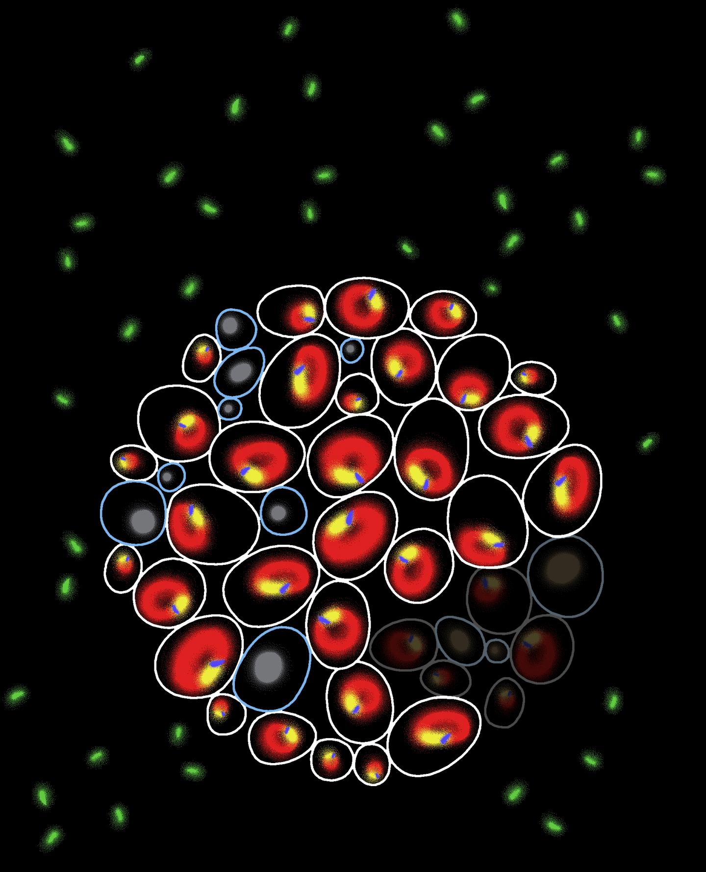 image: Above are fluorescent images of genetically identical yeast cells, marked for some of the biomarkers that UT Southwestern researchers discovered help to predict cell fate. The yellow is the nucleus, the blue and green are nucleus-vacuole junction (NVJ) markers, and the red is the yeast vacuole.