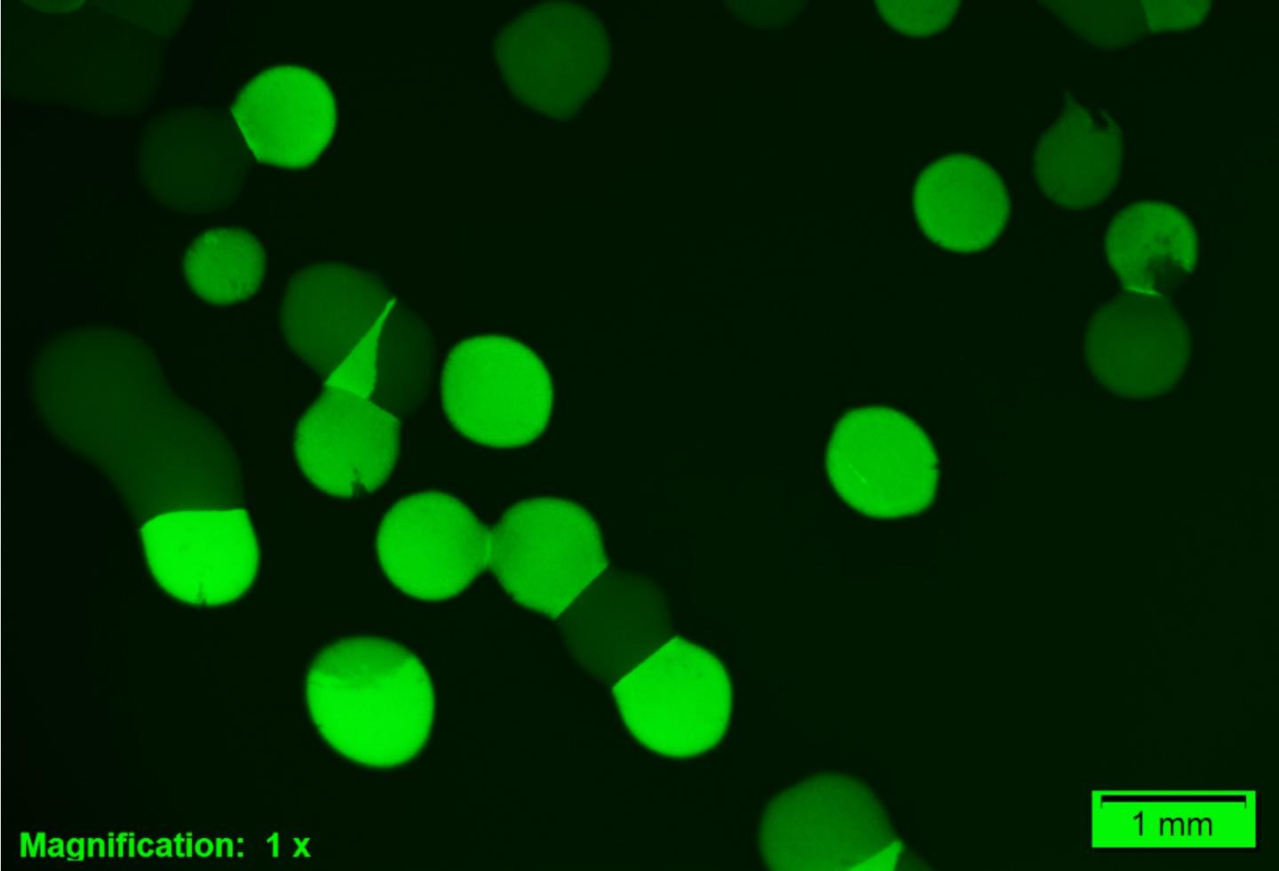 image: In these images, cells expressing the high-affinity methionine transport system light up in fluorescent green. This creates bright green and dark colonies, but also clonal colonies that are in part bright, in part dark, where cells in the same colony have 'chosen' different paths.