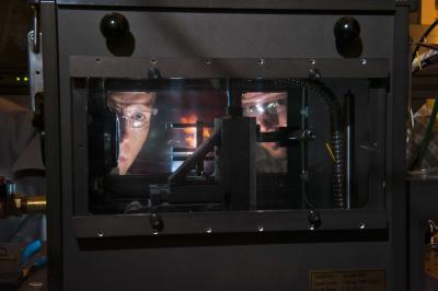 Sandia researchers Alex Tappan (left) and Rob Knepper watch the detonation of a critical thickness experiment. The experiment typically uses less explosive material than the size of one-tenth of an aspirin tablet to determine small-scale detonation properties. The bench-top experiment is so small, researchers can stand next to the firing chamber with eye and ear protection.