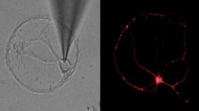 This is a photomicrograph of nerve cell during an electrical recording (left), fluorescently labeled nerve cell (right).