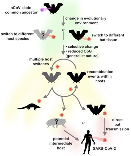 image: Schematic of our proposed evolutionary history of the nCoV clade and putative events leading to the emergence of SARS-CoV-2.