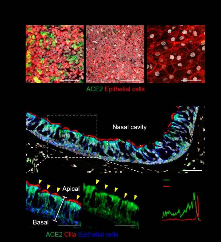 image: (A) en-face view of ACE2 protein signal in human nasal respiratory, nasopharynx transitional, and oral squamous epitheliums. Scale bars, 50 μm. (B) Cross-sectional view of human nasal epithelium showing robust ACE2 protein in acetylated-?-tubulin+ ciliated epithelium (yellow arrowheads). Box region of upper panel is highlighted in lower panels. Scale bars, 50 μm. Profile analysis of relative ACE2 signal intensity along the white line. Note that ACE2 protein is higher in apical side than basal side, while it is not present at motile cilia.