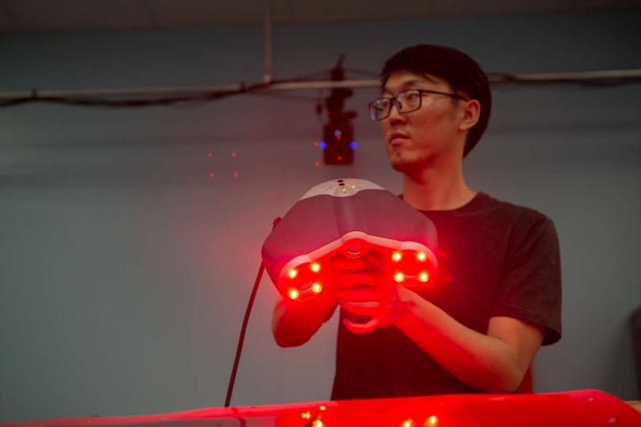 image: University of Cincinnati aerospace engineering student Yufeng Sun holds a laser scanner used to measure and render objects in three dimensions.