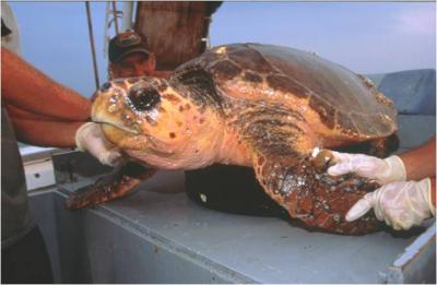 Twenty-nine turtles were captured near Port Canaveral, Florida and fitted with satellite transmitters as part of a National Marine Fisheries Service-funded project. Blood was analyzed for traces of organochlorine pesticides (OCPs), polychlorinated biphenyls (PCBs), polybrominated diphenyl ethers (PBDEs) and toxaphenes, chemicals documented to have carcinogenic and neurodevelopmental effects.