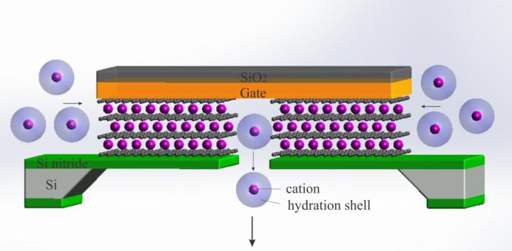 image: Schematic of the atomic-scale ion transistor made of graphene channels of 3 angstrom size. The electric potential is applied to mimic the electric charge on the walls of biological channels and enables ion intercalation and permeable ion transport beyond a percolation threshold.