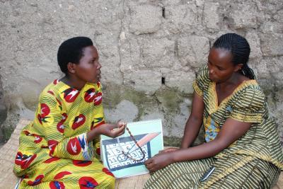 A Rwandan healthcare worker instructs a family planning services client in the Standard Days Method®, a fertility awareness-based method of family planning developed by researchers from Georgetown University's Institute for Reproductive Health.