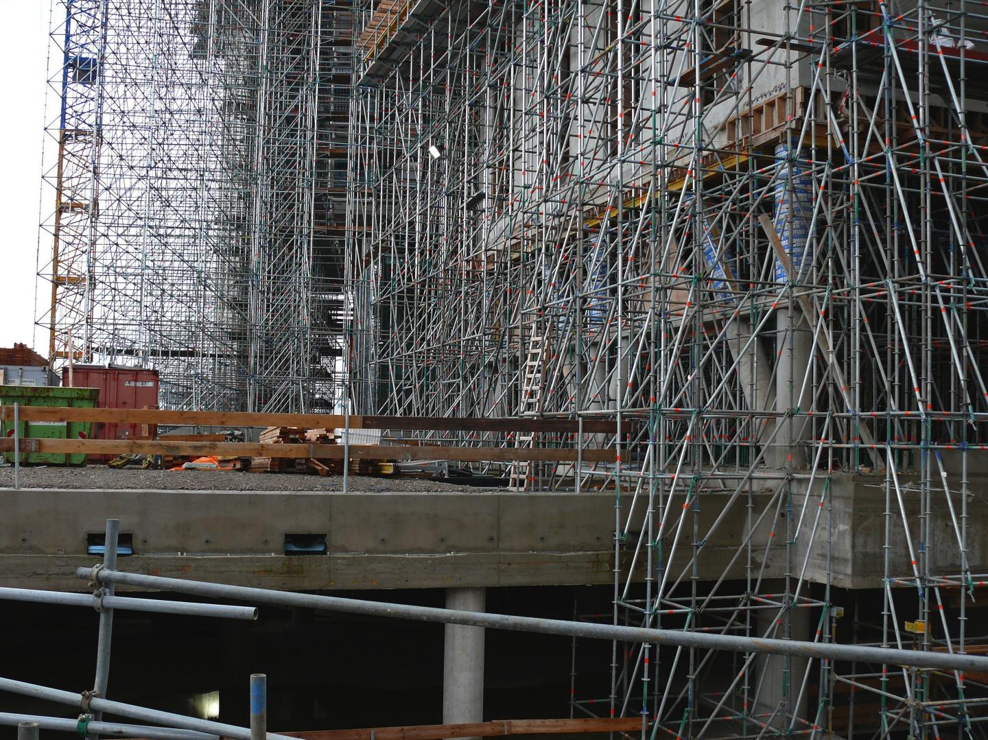 image: A close-up view on huge scaffolding at the construction site for building the new Municipal Library. At the left the thick layers of scaffolds are necessary to support the forward horizontally front-facade.