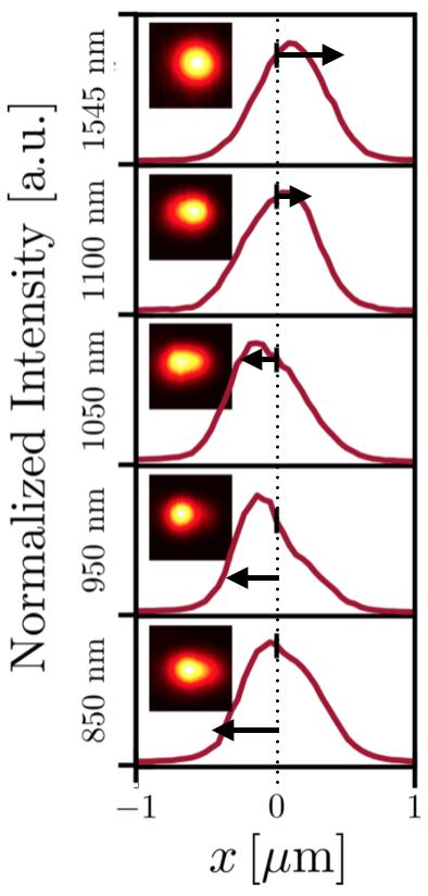 image: This figure shows evidence that the two nanorods were heated to different temperatures. The researchers collected data on how the heated nanorods and surrounding glycerol scattered photons from a beam of green light. The five graphs show the intensity of that scattered light at five different wavelengths, and insets show images of the scattered light. Arrows indicate that peak intensity shifts at different wavelengths, an indirect sign that the nanorods were heated to different temperatures.