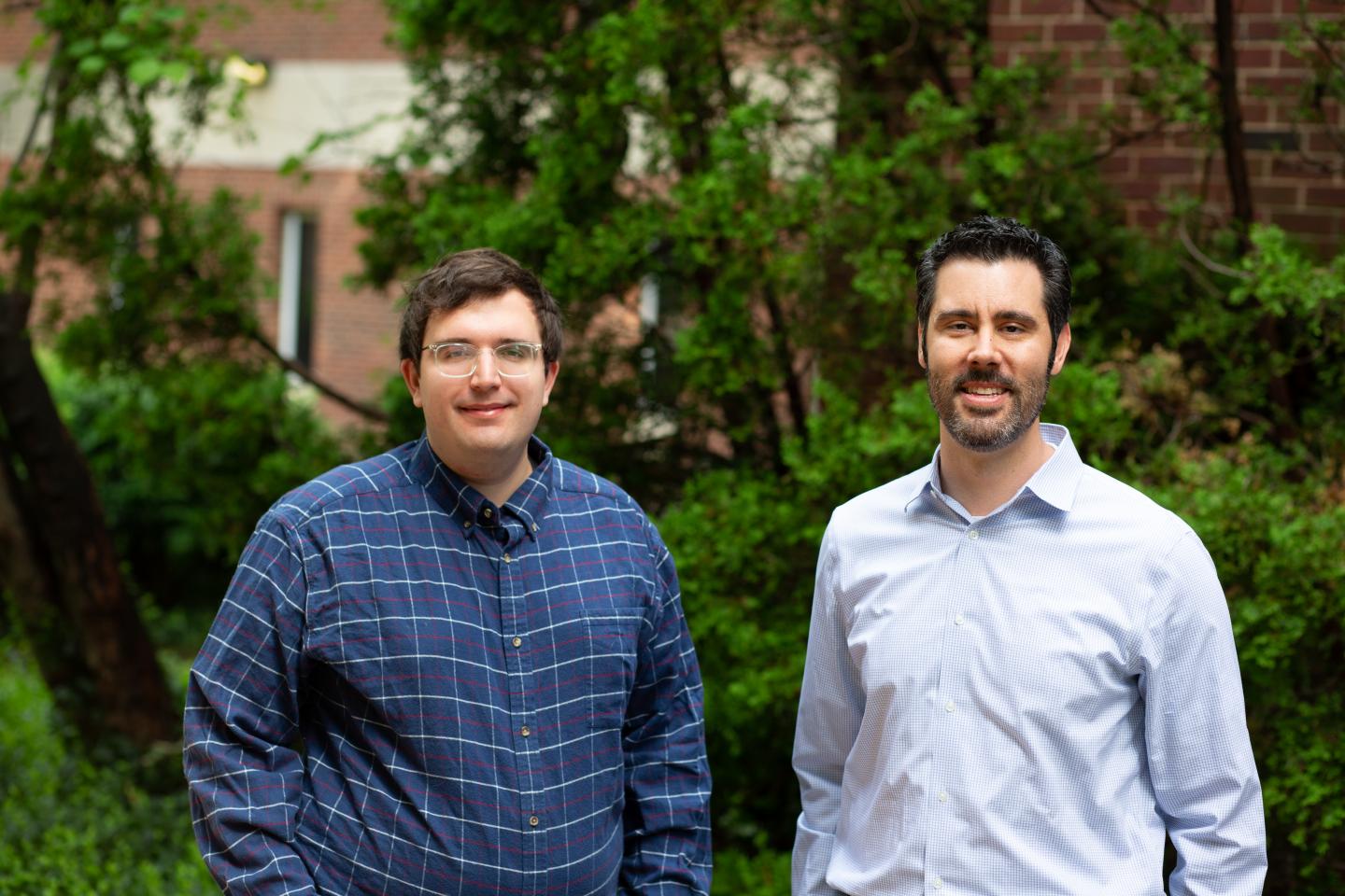 image: University of Illinois professor David Flaherty and graduate student Tomas Ricciardulli demonstrate a more efficient and environmentally friendly method to produce hydrogen peroxide, which is in high demand for its antiseptic properties.