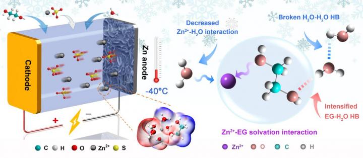 The developed electrolyte, consisting of water (H2O), ethylene glycol (EG) and zinc sulfate (ZnSO4), exhibited high zinc-ion conductivity at low temperature.