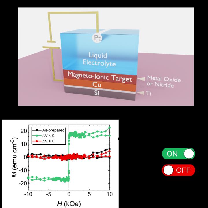 A recent collaborative study between the UAB, Georgetown University, HZDR Dresden, CNM's Madrid and Barcelona, University of Grenoble, and ICN2, and published in the journal Nature Communications has shown that it is possible to switch magnetism ON and OFF in metals containing nitrogen (that is, to generate or remove all magnetic features of this material) with voltage. One simple analogy would be that we are able to increase or completely remove the strength with which a magnet attracts to, for example, the door of a fridge, simply by connecting it to a battery and applying a certain voltage polarity. In this project, cobalt-nitride is shown to be non-magnetic on its own, but when nitrogen is removed with voltage, it forms a cobalt-rich structure which is magnetic (and vice versa). This process is shown to be repeatable and durable, suggesting that such a system is a promising means to write and store data in a cyclable manner. Interestingly, it is also shown to require less energy and it is faster than systems using alternative non-magnetic atoms, such as oxygen, elevating the possible energy savings.