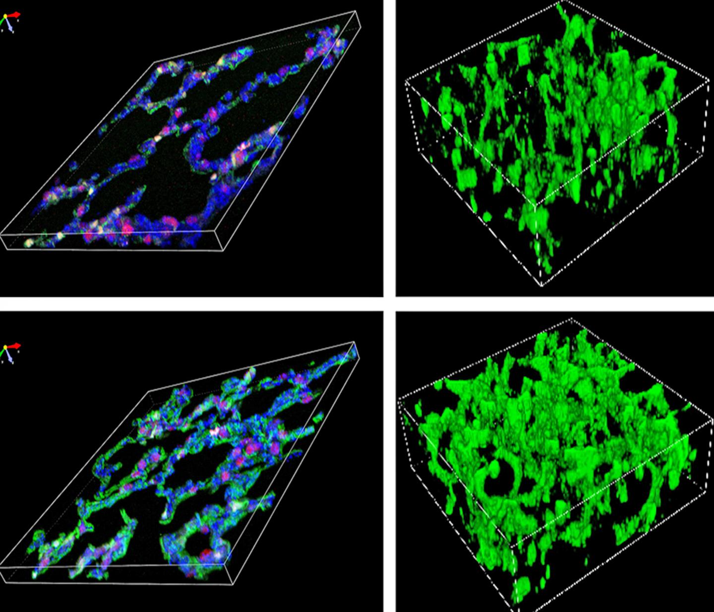image: The top two confocal microscopic images in this panel show underdeveloped pulmonary capillary networks in the lung of a laboratory mouse over exposed to oxygen (hyperpoxia) to mimic bronchopulmonary dysplasia, a condition that disrupts lung development in premature babies. The bottom two images show increased capillary density after a mouse with hyperpoxia was treated with c-KIT+ endothelial progenitor cells, a potential cell-based therapy reported by researchers in the American Journal of Respiratory and Critical Care Medicine.