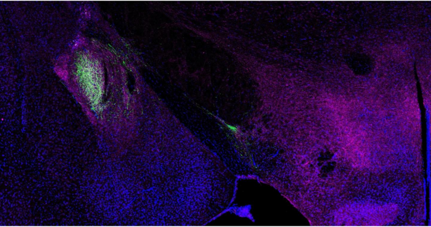 image: This image shows Channelrhodopsin-eYFP neurons (green) expressed in the central amygdala (CeA) neurotensin (NTS) containing neurons. The magenta is antibody staining for the neuropeptide NTS.