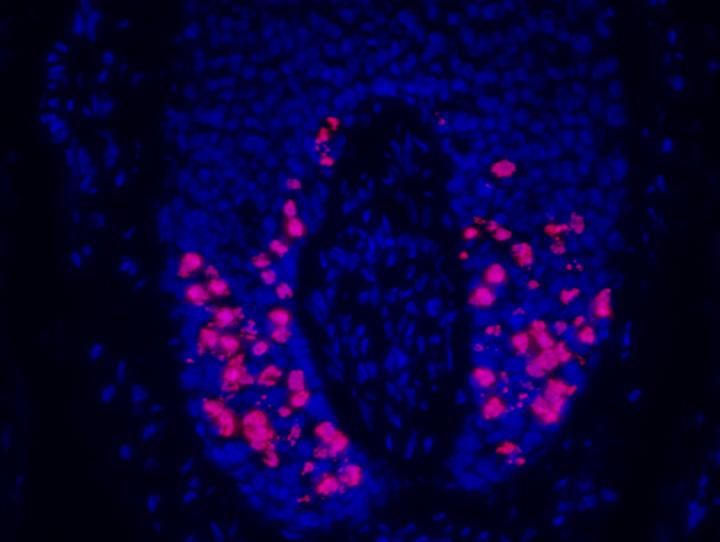 image: Image caption: Phospho-histone H3 (red) and cell nuclei (blue) staining in a human hair follicle treated with Taxotere (docetaxel). The cells in red are unable to properly divide following chemotherapy treatment.