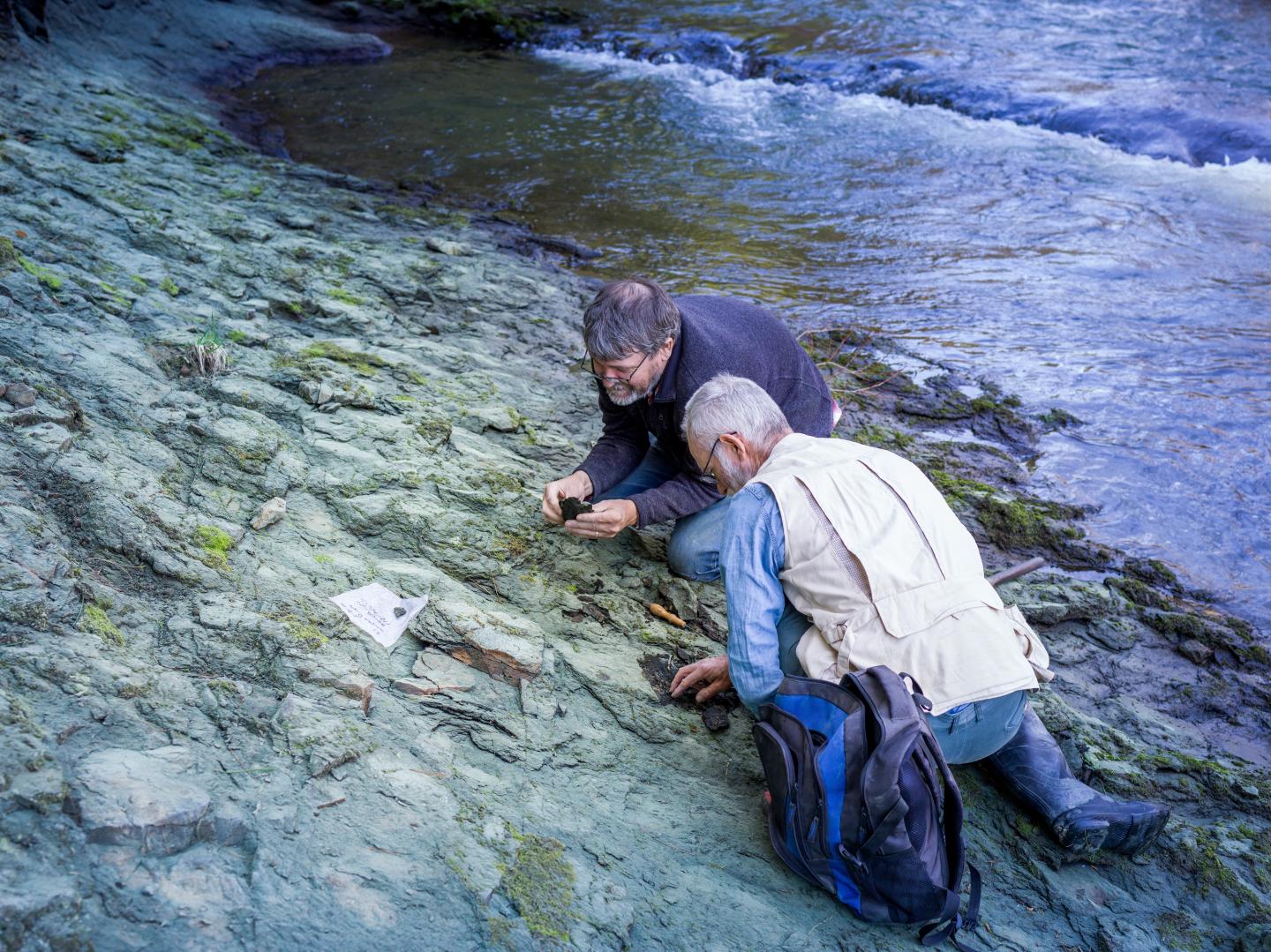 image: Dr. Paul Scofield and amateur palaeontologist Leigh Love examine a section of riverbank on the Waipara River, near where the 'Protodontopteryx' fossil was found