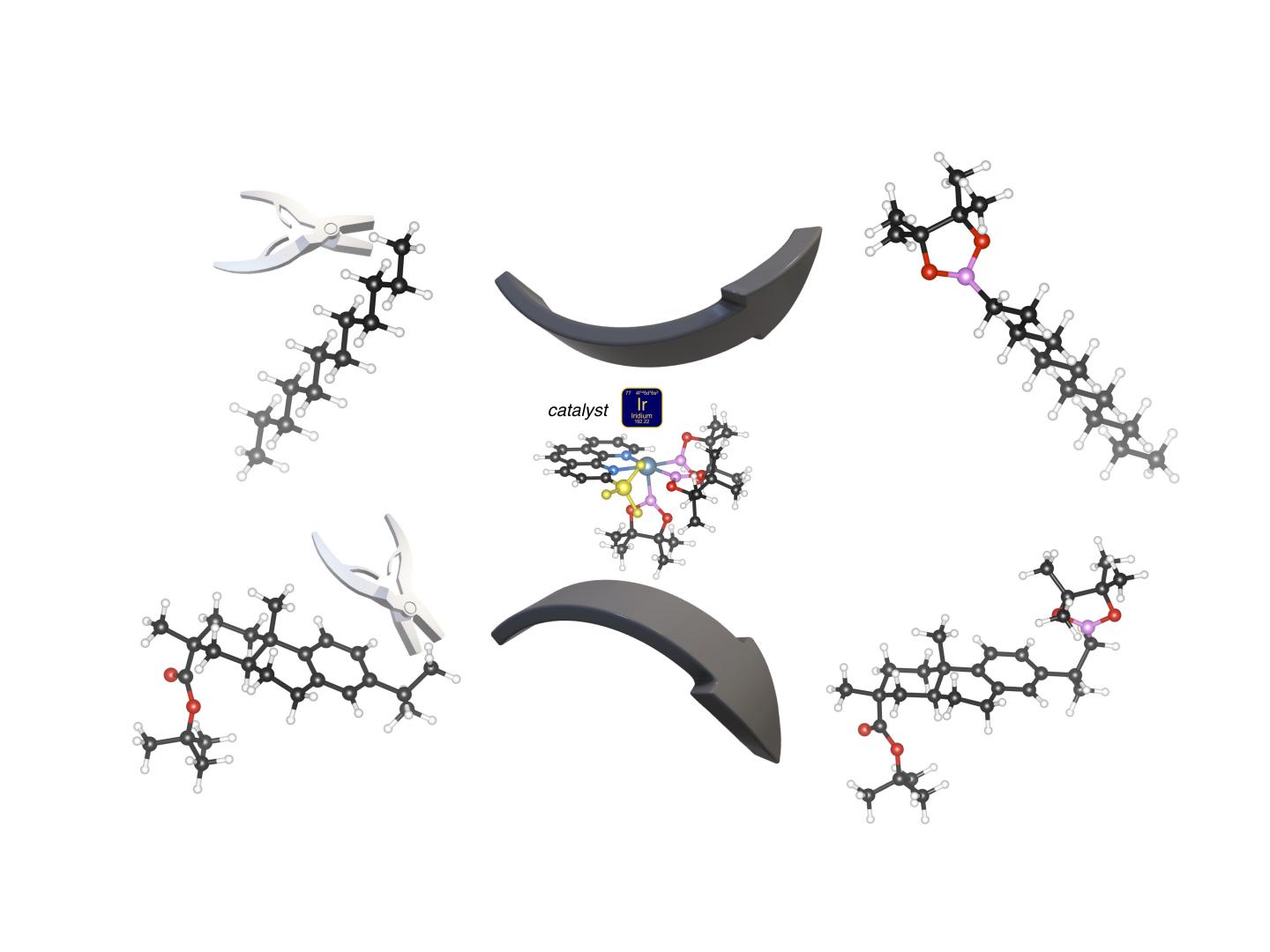 With the addition of the new catalytic reaction, chemists can now stick chemicals in nearly any type of carbon-hydrogen bond. In the reaction, iridium snips off a terminal hydrogen atom, and the boron replaces it; another boron compound floats away with the released hydrogen atom. The team attached a new ligand to iridium -- a methyl group called 2-methylphenanthroline -- that accelerated the reaction by 50 to 80 times over previous results.