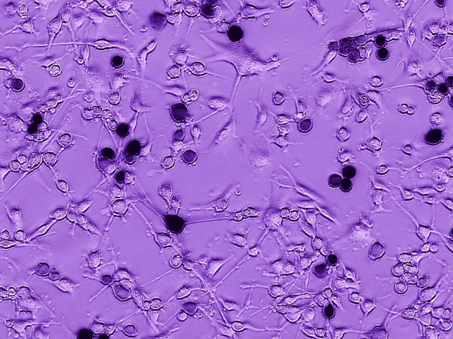 image: Here glioblastoma cells from a human brain are growing. Addition of the Ebola-VSV oncolytic virus results in tumor infection and cell death, seen here as black cells. Over time the infection spreads to other glioblastoma cells.