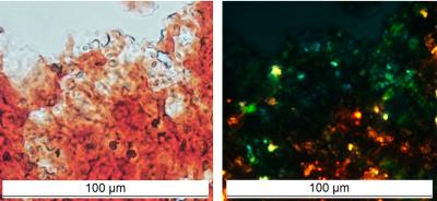 image: Protein FXR1, extracted from the brain of healthy rats, is colourised with an amyloid specific dye 'Congo Red' and shows an apple-green glow in polarised light, which is recognised as the 'gold standard' for amyloid identification.