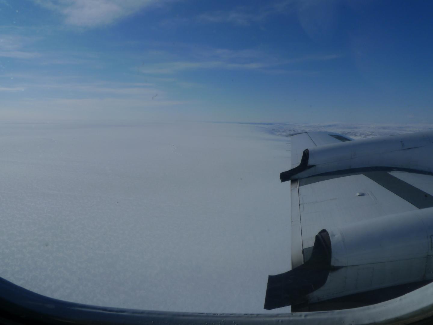 image: The largely featureless surface of the Greenland ice sheet, as seen from the window of a P3 aircraft carrying geophysical instruments aimed at detecting geologic features underneath.