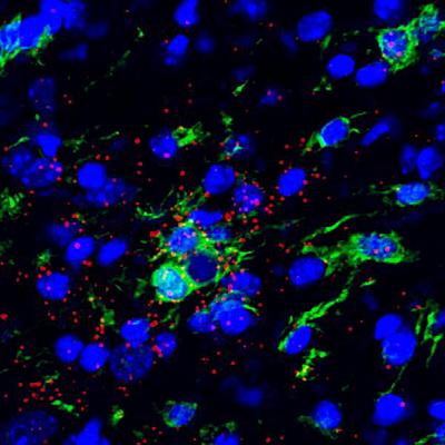 image: Representative confocal microscope image of the ventral horn of the spinal cord from an ALS mouse. Several microglial cells (green) infiltrate the spinal cord as ALS disease progresses. Single molecule FISH detected IRF7 (an interferon-inducible gene) RNA molecules (red) in microglia and other cells.