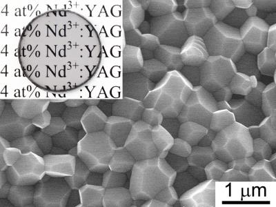 image: experimental high-doped 4 at% Nd3+:YAG with residual porosity is less than 0.02 vol%, in-line optical transmittance is about 87% of the theoretical value, the microhardness of 13.2 GPa, and average grain size is near 740 nm.