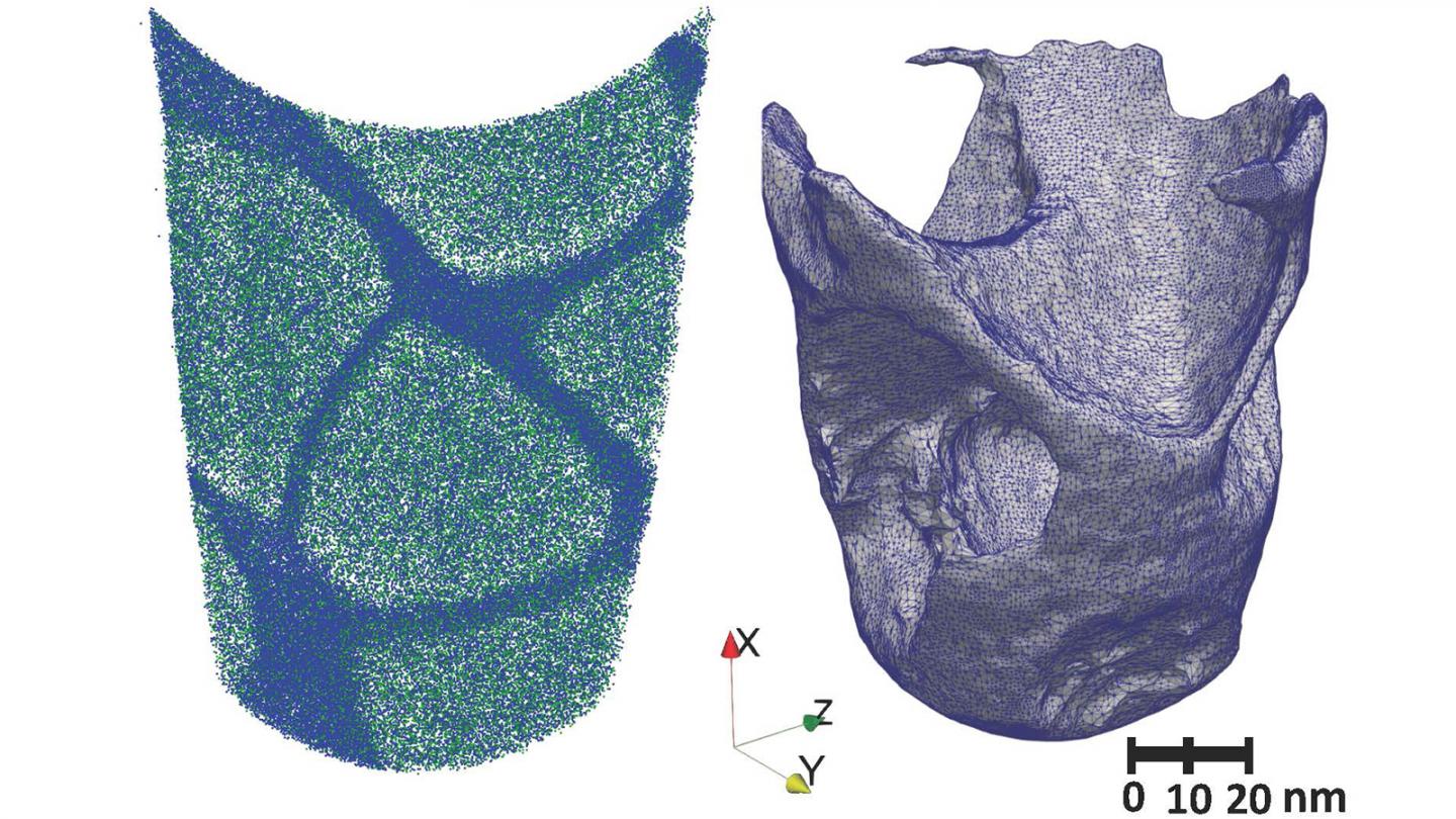 image: Three-dimensional point cloud reconstruction of an entire cobalt superalloy atom-probe tomography specimen (left) and the resulting interface from the edge detection method (right).