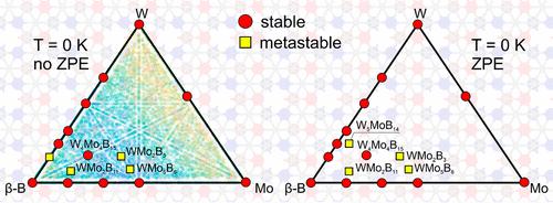 image: Ternary phase diagram of the W-Mo-B system at 0 K