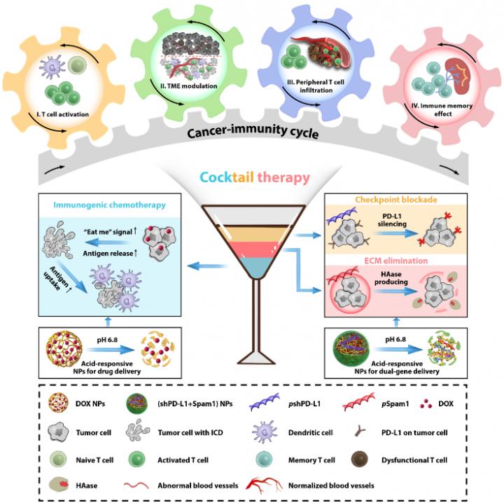 The proposed cocktail therapy achieved anti-tumor treatment by combining immunogenic chemotherapy, immune checkpoint blockade, and extracellular matrix elimination. It consists of two kinds of tumor microenvironment (TME) responsive drug and gene delivery nanoparticles. The smart nano delivery systems can achieve specific delivery of doxorubicin and co-delivery of plasmids expressed small hairpin RNA of PD-L1 and hyaluronidase in the tumor area, leading to improved therapeutic effects.