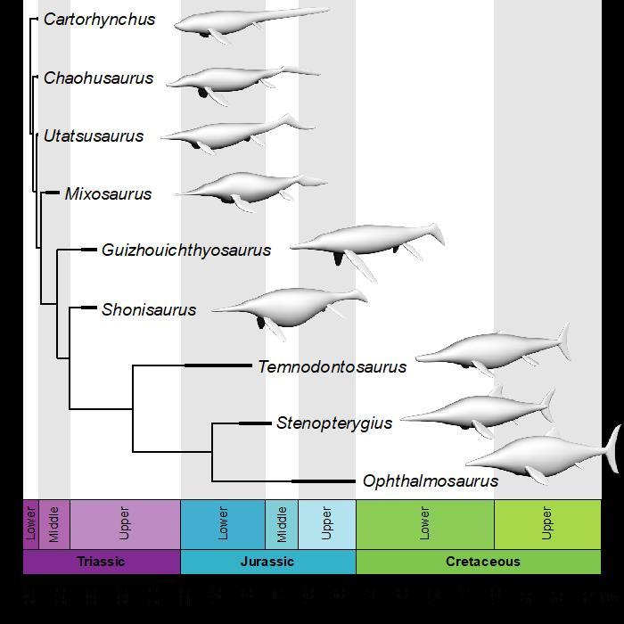 Dr Benjamin Moon, another collaborator from Bristol's School of Earth Sciences, said: "There was a shift in swimming style during ichthyosaur evolution. The most primitive ichthyosaurs swam by body undulations and later on they acquired broad tails for swimming by beating their tails (more efficient for fast and sustained swimming).